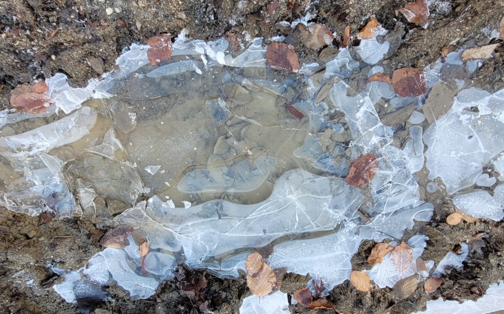 La margine de drum mi-a atras atenția o băltoacă înghețată. Sub pojghița de gheață care simula gerul stăteau la un loc niște pietre. Se vedeau atât de limpede încât nu le-am putut trece cu vederea. Printre ele se rătăciseră niște frunze uscate și terne. Serios, Doamne, aici ți-ai găsit să le pui? Era mai bine, peste drum, pe lângă copacii aia imenși cu rădăcini înfricoșător de puternice. Sau, nu că se prăvăleau sub lumina soarelui. Ai și Tu dreptate, înghețate la ce să mai folosească…pietrele, zic. Nu aveam cum să ratez ocazia de a fotografia și această ipostază a naturii care și înghețată este uimitoare.